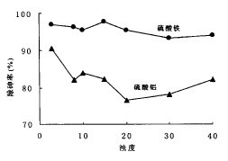 硫酸鐵和硫酸鋁為比較實用的對分散式供水的除砷劑。在不同pH值、水溫、濁度、硬度等條件下硫酸鐵對水樣的除砷性能較硫酸鋁穩(wěn)定。直接投加50mg/L硫酸鐵于含As(Ⅴ) 1 .0mg/L的水樣中,在室溫下混凝沉淀靜置12h后,可使傾析液的殘留砷含量降至0.05mg/L 以 下。投加30mg/L硫酸鐵或40mg/L硫酸鋁并加以過濾,也可使As(Ⅴ) 降至0.05mg/L 以下。