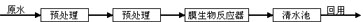 膜生物反應(yīng)器(Membrane Biological Reactor,簡稱MBR)是將膜組件引入廢水處理氧化池中的一種新型污水處理技術(shù)。在MBR中,活性微生物與污水充分接觸氧化,不斷氧化污水中能被微生物降解的有機物,而不能被微生物降解的有機物和無機物及活性污泥、懸浮物、各類膠體、大部分細(xì)菌則被MBR中的膜組件截留,活性污泥濃度大大提高,實現(xiàn)了水力停留時間和泥齡的完全分離。MBR對于原水水質(zhì)的的變化均有很強的適應(yīng)性,保證出水水質(zhì)的穩(wěn)定,集生物反應(yīng)器的生物降解作用和膜的高效分離作用于一體,大大強化了生物反應(yīng)器的功能。MBR工藝流程見圖1。
