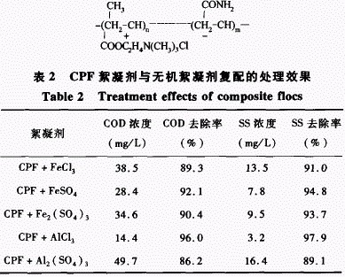 由表1可知,與FeCI3、FeSO4、Fe2(SO4)3、AICI3和Al2(SO4)3,5種無(wú)機(jī)絮凝劑相比,CPF絮凝劑用量最少,且處理效果最好。5種無(wú)機(jī)絮凝劑中,以AICI,處理效果最好,F(xiàn)eSO4次之,Al2(SO4)3最差。CPF絮凝劑的絮凝機(jī)理主要是吸附電中和機(jī)理和吸附架橋機(jī)理。CPF的高分子鏈上帶有正電荷,其化學(xué)結(jié)構(gòu)為: