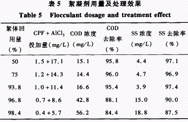 由表5可知,隨著絮體回用量的增多,絮凝劑的用量逐漸減少,且處理效果仍然很好。當(dāng)絮凝劑用量減至一定值(CPF+A1C13=1.0+11.4 mg/L)后,再繼續(xù)減少用量,處理效果明顯下降。這是因?yàn)樾躞w的回用,一方面可以增加晶核,減少絮凝劑的用量,另一方面破碎的絮體要再次沉降也需消耗絮凝劑,因此絮凝劑用量的減少也是有一定限度的。所以,采用絮體回用的方法,CPF+AIC13復(fù)配絮凝劑的用量最多可減至1.0+11.4 mg/L,且處理效果仍然很理想,處理結(jié)果大大優(yōu)于出水水質(zhì)控制指標(biāo)。