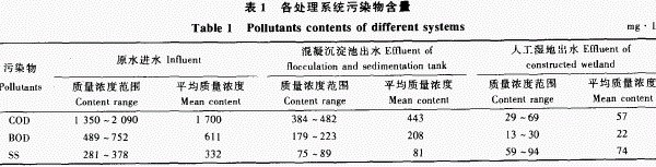 污水處理前COD,BOD和ss平均質(zhì)量濃度分別為1 700,611,332 mg·L~,經(jīng)混凝沉淀和YSH一人工濕地系統(tǒng)后,污染物質(zhì)量濃度降低分別為1 630。580.260 mg·L~.出水質(zhì)量濃度符合DB41/389-2004(河南省造紙工業(yè)水污染物排放標(biāo)準(zhǔn)》中I時(shí)段標(biāo)準(zhǔn)(COD≤100 mg·L~,BOD≤40 mg·L~.SS≤100 mg·L )要求,系統(tǒng)運(yùn)行穩(wěn)定,沒(méi)有單次超標(biāo)現(xiàn)象.