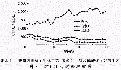 (3)廢水經(jīng)鐵屑內(nèi)電解處理后,BOD5/CODcr由原來的0.14增加到了0.31,大大提高了廢水的可生化性。再經(jīng)生物處理后,CODcr的去除率>90%。