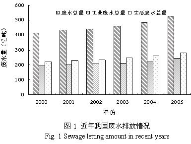 我國環(huán)境產(chǎn)業(yè)出現(xiàn)較晚,絕大部分污水處理廠都是在八十年代以后建成的。在80年代以前,我國污水處理產(chǎn)業(yè)一直發(fā)展緩慢。改革開放后,我國污水處理廠迅速增加,工業(yè)與城市污水處理有了很大的發(fā)展。2003年,全國共設有511座城市污水處理廠,全年處理工業(yè)廢水和生活污水共77.5億噸,主要城市污水排放量為460億噸,其中生活污水248億噸,城鎮(zhèn)污水處理率為25.8%,比上年提高3.5個百分點。從我國整體污水處理率來看都遠遠低于發(fā)達國家水平。隨著工業(yè)化進程的增加及人們生活水平的提高,近年來我國廢水排放總量逐年增加(圖1)。根據(jù)國家環(huán)境保護“十五”計劃要求,到2005年,我國城市生活污水集中處理率要達到45%,50萬人口以上的城市要達到60%,重點城市達到70%[1~2]。實際上,2005年城市污水處理率為52%,城市生活污水處理率為37%[3],沒有達到國家環(huán)境保護“十五”計劃要求。隨著城市生活污水的排放量的逐年增加(圖1),以及為了完成國家環(huán)境保護的目標,我國城市污水處理產(chǎn)業(yè)在近期將有飛速的發(fā)展。