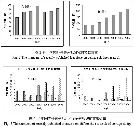 國外有關污泥的研究工作起步較早,美國早在二十世紀七、八十年代就對污泥的性質與組成進行了大量研究,明確了污泥的潛在利用價值及土地利用可能帶來的環(huán)境風險[4]。圖2A是利用Elsevier數(shù)據(jù)庫對近年來國外有關城市污水污泥基本性質、風險評估、處理處置等方面研究文獻的統(tǒng)計,結果表明,有關污泥研究的文獻數(shù)量有逐年增加的趨勢,說明國際上有關污泥的研究一直得到科研工作者們的重視。這是因為:首先,隨著污水處理產(chǎn)業(yè)的發(fā)展,污泥的產(chǎn)生量越來越大。其次,污泥的海洋處置已經(jīng)終止,隨著垃圾填埋場地的減少,可用于污泥衛(wèi)生填埋的場所越來越少,人們不得不為污泥尋找新的出路。第三,隨著對資源循環(huán)利用要求的增加,土地利用成為污泥的重要處置方式之一,污泥的農(nóng)藝價值倍受關注。第四,由于人們環(huán)境意識的增強,污泥處置帶來的環(huán)境風險受到社會的普遍關注。