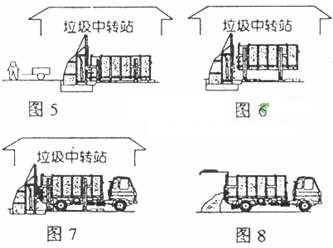 垃圾壓縮轉(zhuǎn)運站的車箱升降裝置再把專用車箱放下,垃圾壓縮機的液壓系統(tǒng)將專用車箱與垃圾壓縮機對接結(jié)合。通過垃圾壓縮機就地將垃圾收集破碎壓縮送入專用車箱內(nèi)。車箱裝滿垃圾后,液壓站的液壓系統(tǒng)將專用車箱與垃圾壓縮機分離,并將專用車箱升起。汽車底盤倒車回垃圾轉(zhuǎn)運站,垃圾壓縮轉(zhuǎn)運站的車箱升降裝置將專用車箱降下,把專用車箱與汽車底盤結(jié)合成一體(見圖7)。汽車開出轉(zhuǎn)運站,將垃圾運到垃圾處理場,汽車用車上專用的液壓裝置將垃圾推卸出車箱,倒空垃圾(見圖8)。專用汽車垃圾壓縮車開回垃圾壓縮轉(zhuǎn)運站,再收集壓縮垃圾。周而復(fù)始,循環(huán)作業(yè)。