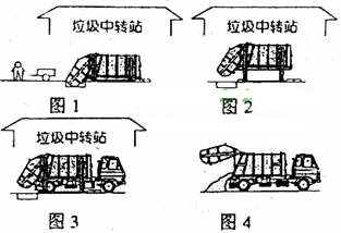 垃圾壓縮轉(zhuǎn)運站專用的車箱與汽車底盤是做成可分離式的,當收集壓縮垃圾時,將專用車箱分離并放到垃圾壓縮轉(zhuǎn)運站內(nèi),然后,用垃圾壓縮轉(zhuǎn)運站內(nèi)的液壓站的動力收集壓縮垃圾(見圖1)。垃圾壓縮轉(zhuǎn)運站的工作過程如下:專用的后裝式壓縮垃圾車倒車進入中轉(zhuǎn)站,垃圾壓縮轉(zhuǎn)運站的車箱升降裝置將車箱升起,把車箱與汽車底盤分離,汽車底盤開出中轉(zhuǎn)站(見圖2)。車箱升降裝置將車箱放下,然后,用中轉(zhuǎn)站內(nèi)的液壓站的動力收集壓縮垃圾。車箱裝滿垃圾后,由垃圾壓縮轉(zhuǎn)運站內(nèi)的車箱升降裝置將車箱升起。倒進汽車底盤,將車箱與汽車底盤重新結(jié)合成后裝式壓縮垃圾車(見圖3),開出垃圾壓縮轉(zhuǎn)運站,將垃圾運往垃圾處理場。汽車用車上專用的液壓裝置將垃圾推卸出車箱,倒出垃圾(見圖4)。這種垃圾壓縮轉(zhuǎn)運站保持了后裝式壓縮垃圾車優(yōu)點,實現(xiàn)垃圾壓縮密閉化運輸,有效地控制了垃圾二次污染。同時解決了后裝式壓縮垃圾車流動性收集垃圾時,汽車發(fā)動機工作產(chǎn)生噪音、排出廢氣、滴漏污水,造成環(huán)境污染的向題。因為垃圾壓縮轉(zhuǎn)運站是用電力作動力進行收集壓縮垃圾作業(yè)的。