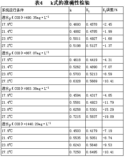 將4個進(jìn)水COD的質(zhì)量濃度:490.35,867.07,983.38和1440.20mg/L,依次代入冬季k與Yo的關(guān)系式k=-0.000 02 Yo+0.479 1,可估算出4個k,依次是:0.469 3,0.461 8,0.459 4和0.450 3 d-1。同理,將上述4個進(jìn)水COD值代入夏季k與Yo的關(guān)系式k=0.000 3Yo+0.372 7,求出4個相應(yīng)的k,依次是:0.519 8,0.632 8,0.721 5和0.725 0d-1。