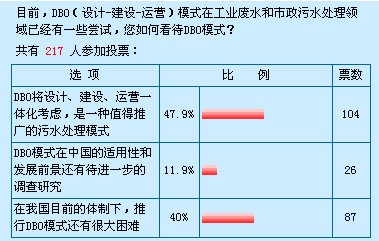此次調(diào)查主要目的是希望了解水業(yè)人士對DBO模式的認識以及接受程度,調(diào)查發(fā)布10天以來,共有217人參加了問卷的填寫,有47.9%的人認為DBO模式是一種值得推廣的污水處理模式,但是也有40%的人認為在我國目前的體制下推行DBO模式還有很大困難,還有少數(shù)人(11.9%)認為DBO模式在我國的發(fā)展前景還有待進一步的調(diào)查研究。