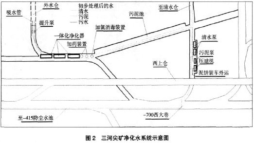 利用井下水倉就地處理污水,避免將污水送到地面時(shí)造成二次污染。另外,將外水倉兼作初次沉淀池處理,處理后的水直接用于井下,免去將污水提升到地面處理后再送人井下利用的動(dòng)力、管材等浪費(fèi)。同時(shí)可免去地面重修沉淀池。三河尖礦凈化水系統(tǒng)示意圖如圖2所示。