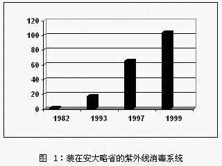 1984年美國(guó)環(huán)保署(US EPA)報(bào)道了52套紫外線消毒裝置,另外35個(gè)項(xiàng)目正在設(shè)計(jì)中,30個(gè)項(xiàng)目正在建造中。其中TILLSONBURG已經(jīng)安裝使用了加拿大的設(shè)備,COLLINGWOOD作為一個(gè)建設(shè)項(xiàng)目。到1992年,紫外線污水消毒設(shè)備的數(shù)量已增加到424套(EPA,1992)。