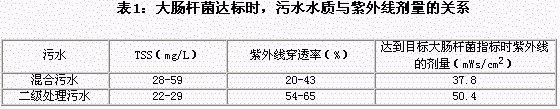 1984年HO和BOHM(1984)在RICHMOND HILL WPCP經(jīng)過6個(gè)月的研究,繼續(xù)對(duì)紫外線消毒進(jìn)行評(píng)估。二級(jí)處理污水經(jīng)過常規(guī)的活性污泥法、加氯化鐵除磷再流經(jīng)紫外線進(jìn)行中試。通過增加導(dǎo)流板和分配管來改變16根燈的中試系統(tǒng)。紫外線劑量為25mWs/cm2 時(shí),大腸桿菌的總數(shù)在200到500/100ml。劑量為50mWs/cm2時(shí),大腸桿菌的減少?zèng)]有明顯提高。在實(shí)驗(yàn)中采用二級(jí)處理污水和一級(jí)處理污水相混合來模擬一級(jí)混合污水的水質(zhì),二級(jí)污水中固體顆粒所含鐵的濃度較高,要達(dá)到大腸桿菌指標(biāo)時(shí),需要較高的紫外線劑量(表1)。鐵濃度對(duì)紫外線劑量的影響要高于一級(jí)混合污水中高TSS濃度的影響。實(shí)驗(yàn)中每8小時(shí)手動(dòng)清潔石英管壁。