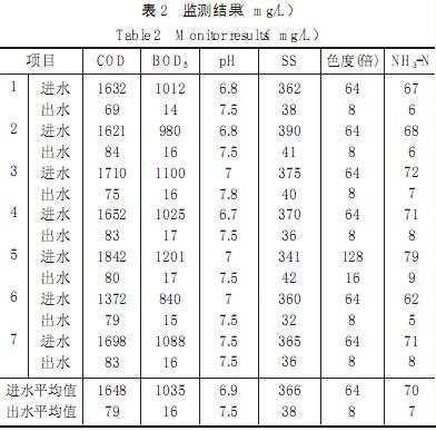 整個(gè)工藝的啟動(dòng)調(diào)試分4個(gè)階段,污泥馴化培養(yǎng)階段、顆粒污泥形成階段、提高處理負(fù)荷階段和顆粒污泥富集階段。厭氧工段所需污泥取自某城市污水處理廠的脫水硝化污泥,好氧工段所用污泥取自城市污水處理廠的好氧脫水污泥。調(diào)試時(shí)首先將厭氧池升溫至35℃左右,控制進(jìn)水量在90m3/h左右,白天進(jìn)水,晚上停止進(jìn)水,同時(shí)清理UASB和氧化溝液面上由污泥帶入的雜物,注意觀察液面,不讓厭氧池和氧化溝內(nèi)污泥流失。如果出水中帶有大量的污泥則停止進(jìn)水,同時(shí)監(jiān)測(cè)控制UASB反應(yīng)器進(jìn)水總量、進(jìn)出水pH值、溫度,將UASB反應(yīng)器進(jìn)水pH值控制在6.5~7.5之間。然后逐步加大水量,并控制揮發(fā)酸濃度在3mg/L以?xún)?nèi)。每天對(duì)COD定期監(jiān)測(cè),當(dāng)COD去除率達(dá)到75%以上時(shí),再逐步增大流量。經(jīng)過(guò)3個(gè)月的調(diào)試,系統(tǒng)調(diào)試成功并投入正常運(yùn)行。正常運(yùn)行后連續(xù)7d監(jiān)測(cè)結(jié)果見(jiàn)表2。
