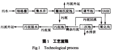 集水井進(jìn)水口設(shè)細(xì)格柵機(jī),去除一些較大的懸浮物和漂浮物。污水自流進(jìn)入集水井,從集水井用水泵提升到撇油沉淀池,進(jìn)行除油和初次沉淀,并設(shè)污泥泵將沉淀污泥輸送至污泥池。廢水在調(diào)節(jié)池停留一定的時(shí)間勻質(zhì)勻量后,用污水泵抽送到UASB反應(yīng)器的底部,在UASB反應(yīng)器內(nèi)進(jìn)行厭氧處理。廢水在氧化溝進(jìn)行好氧處理,降解廢水中剩余的有機(jī)物。在氧化溝內(nèi)曝氣器的作用下,廢水與污泥在各槽內(nèi)循環(huán)流動(dòng),處于完全混合狀態(tài),接觸效果好,生化反應(yīng)完全。廢水經(jīng)UASB+氧化溝處理后,90%以上的有機(jī)物被去除。氧化溝的出水進(jìn)入二沉池,經(jīng)沉淀后,出水pH值、COD、BOD5、SS、NH3-N、色度等指標(biāo)都能達(dá)到排放標(biāo)準(zhǔn)。二沉池污泥進(jìn)入污泥濃縮池,經(jīng)濃縮后回流到氧化溝內(nèi),剩余污泥進(jìn)入池,經(jīng)污泥脫水機(jī)脫水形成泥渣后外運(yùn)處置。