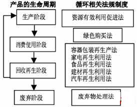 在靜脈產(chǎn)業(yè)發(fā)展過程中,不同的參與者圍繞著廢棄物發(fā)生了一系列的經(jīng)濟(jì)關(guān)系和社會(huì)責(zé)任義務(wù)關(guān)系。因此,靜脈產(chǎn)業(yè)的發(fā)展不僅是用市場(chǎng)經(jīng)濟(jì)所有的法律法規(guī),還需要一些特殊的法律來明確利益相關(guān)者的“責(zé)、權(quán)、利”關(guān)系。日本發(fā)展靜脈產(chǎn)業(yè)的法律法規(guī)非常健全,在產(chǎn)品的整個(gè)生命周期從生產(chǎn)、消費(fèi)、到回收利用以及廢棄階段,都制定了嚴(yán)密的法規(guī)體系,如圖1所示。