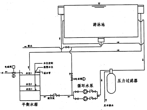 3.過濾器反洗或其它缺水后水位降至水位3,此時補水電磁閥②打開,池底同流管上電動閥①開大至某一位置,此時控制到大量水由回流管進入過濾器,平衡水箱出水量與補水量相同。