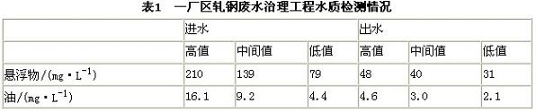 軋鋼廢水閉路循環(huán)治理工程,于1996年投入運行,經(jīng)合肥市環(huán)境監(jiān)測站和合鋼公司環(huán)境監(jiān)測站對治理效果進行監(jiān)測,結(jié)果表明,各項治理指標均達到循環(huán)水質(zhì)要求(見表1),治理效果明顯。