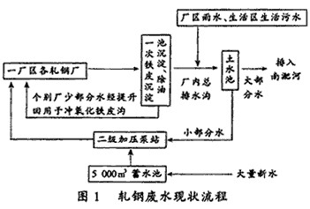 合肥鋼鐵公司一廠區(qū)軋鋼廠軋鋼廢水現(xiàn)狀流程見圖1。各軋鋼廠廢水總量為1600m3/h,水循環(huán)利用率僅為20%左右,且循環(huán)水質(zhì)差。大量含有氧化鐵皮、廢油等污染物的廢水排入附近的河流,據(jù)測定,排出水懸浮物含量高時為200 mg/L以上,油含量高時為15 mg/L以上,給受納水體造成了污染,合肥市政府將合鋼一廠區(qū)軋鋼廢水治理列入了合肥市重點污染源治理工程。