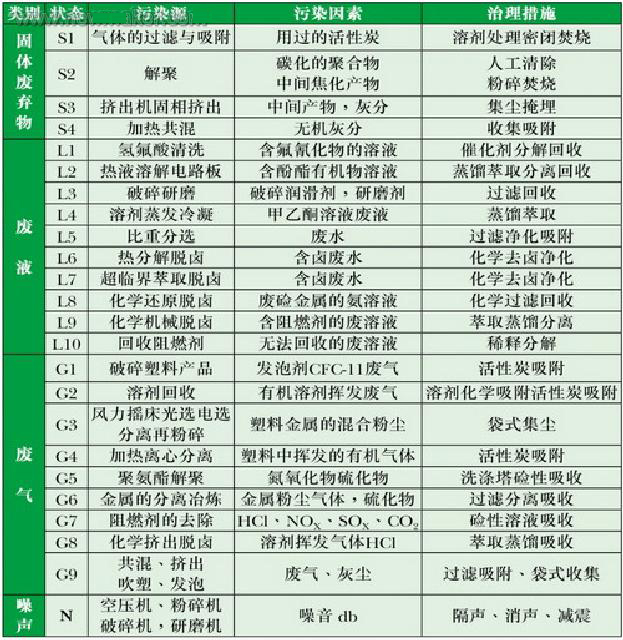塑料回收再生流程對(duì)環(huán)境的影響是指整個(gè)過程中各環(huán)節(jié)各種排放量的總和。表1列出了廢塑料處理過程中可能存在的污染物質(zhì)。