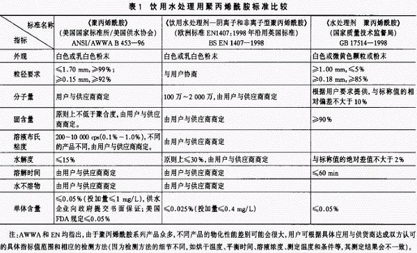 我國現(xiàn)行有效的PAM 產(chǎn)品標(biāo)準(zhǔn)為《水處理劑聚丙烯酰胺》(GB17514-1998),現(xiàn)將其同美國和歐盟的標(biāo)準(zhǔn)作一比較(見表1)。