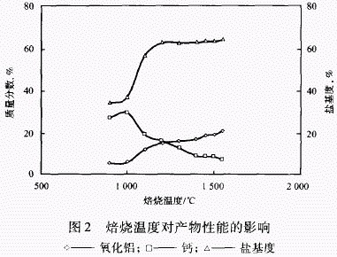 由圖2可見(jiàn),氧化鋁含量隨焙燒溫度的增加而增大;鈣含量隨焙燒溫度的增加而減;鹽基度在初始階段隨焙燒溫度的增加而增大,但超過(guò)1 200℃ 以后變化不大。而且在高溫條件下消耗較多的能量,對(duì)設(shè)備的要求高,因而確定適宜的焙燒溫度為1 200℃ 。