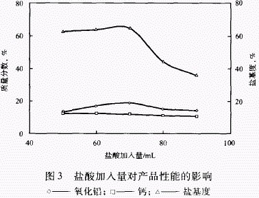將所得鋁酸鈣碾成粉末,稱取10 g,加入70 mL鹽酸,沸騰蒸餾數(shù)小時(shí),經(jīng)冷卻后過(guò)濾,結(jié)晶得到聚合氯化鋁鈣固體產(chǎn)品。取一定量的固體產(chǎn)品溶解后測(cè)定氧化鋁含量、鈣含量、鹽基度。結(jié)果見(jiàn)圖2。