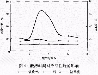 由圖4可以看出,隨著酸溶時(shí)間的延長(zhǎng),氧化鋁含量增加,但增加速度緩慢,最后氧化鋁的含量基本穩(wěn)定。鹽基度在開(kāi)始一段時(shí)間內(nèi)增加,但反應(yīng)3h時(shí),聚合氯化鋁鈣已經(jīng)聚合到一定程度,當(dāng)反應(yīng)時(shí)間再延長(zhǎng)時(shí)鹽基度不再增加,反而減小。酸溶適宜的時(shí)間為3 h。