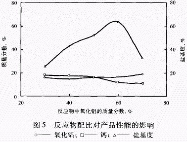 由圖5可見(jiàn),隨著氧化鋁加入量的增加,產(chǎn)品中氧化鋁的含量也隨之增加,但增加幅度不是很大。因?yàn)榧尤氲难趸X多了,所以酸溶時(shí)溶出的Al”就隨之增多。隨著氧化鋁加入量的增加,鹽基度先增大后減小,在氧化鋁的質(zhì)量分?jǐn)?shù)為60% 時(shí)有最大的鹽基度;當(dāng)氧化鋁的質(zhì)量分?jǐn)?shù)繼續(xù)增大時(shí),鹽基度反而減小。因此,確定氧化鋁與碳酸鈣適宜的配比為3:2(質(zhì)量比)。
