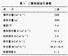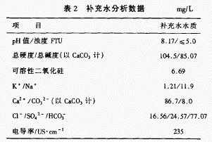 獨山子分公司煉油廠二循系統(tǒng)負責(zé)向Ⅱ催化裂化、鉑重整、加氫裂化、芳烴抽提、石蠟成型及火炬生產(chǎn)裝置供水,換熱器主要材質(zhì)為碳鋼,其系統(tǒng)的運行參數(shù)見表1,補充水水質(zhì)分析數(shù)據(jù)見表2。煉油廠根據(jù)二循實際情況選用了全有機高效緩蝕阻垢劑73 —720,并對此進行了性能試驗。