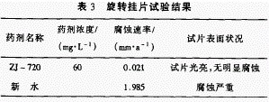 (1)ZJ一720具有優(yōu)異的緩蝕性能,掛片表面清潔,無點蝕和銹蝕,試管腐蝕速率0.029mm/a,達到很好級別(國家標(biāo)準(zhǔn):$5001—83:很好0~0.037mm/a;好0.037 ~ 0.070mm/a;可以允許0.070~0.093mm/a);