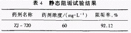 靜態(tài)阻垢試驗著重評價ZJ一720藥劑的阻垢性能,試驗方法按中國石油化工總公司冷卻水分析和試驗方法中的靜態(tài)阻垢評定試驗方法。