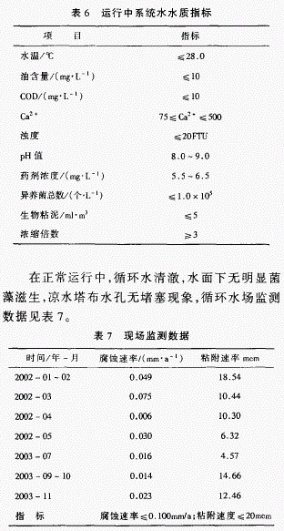 獨山子分公司煉油廠二循環(huán)水廠于2001年12月開始用全有機高效緩蝕阻垢劑ZJ一720替代原有配方。循環(huán)水水質(zhì)數(shù)據(jù)始終保持在表6中的數(shù)據(jù)范圍內(nèi)。
