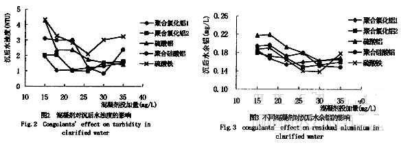 由圖2和圖3得到,使用不同混凝劑的除濁和除鋁效果是有差異的:1)硫酸鋁無(wú)論是除濁還是除鋁的效果都較差;2)聚合硅酸鋁、聚合鋁等高分子類混凝劑都具有較好的除濁和除鋁效果:3)硫酸鐵除濁效果較差,對(duì)除鋁而言,其效果要略優(yōu)于鋁鹽,這主要是因?yàn)樵摶炷齽┳陨砦聪蛩幸敫嗟匿X。分析上述結(jié)果,可以發(fā)現(xiàn):1)對(duì)于原水中含有的鋁,使用鐵鹽也不能使之完全被去除,因此避免使用鋁鹽混凝劑并不是解決鋁問(wèn)題的根本性辦法;2)使用同一種混凝劑除濁和除鋁所對(duì)應(yīng)的最佳投藥量有共同范圍段,這既說(shuō)明鋁主要是伴隨濁度的去除而去除的,同時(shí)也為選擇工藝條件時(shí)兼顧除濁與除鋁提供了可能;3)一般除濁對(duì)應(yīng)的最佳投藥量范圍較寬,而除鋁對(duì)應(yīng)的范圍則較窄,要兼顧二者的去除,就應(yīng)更準(zhǔn)確地控制投藥量,給棍凝投藥過(guò)程控制提出了更高的要求。