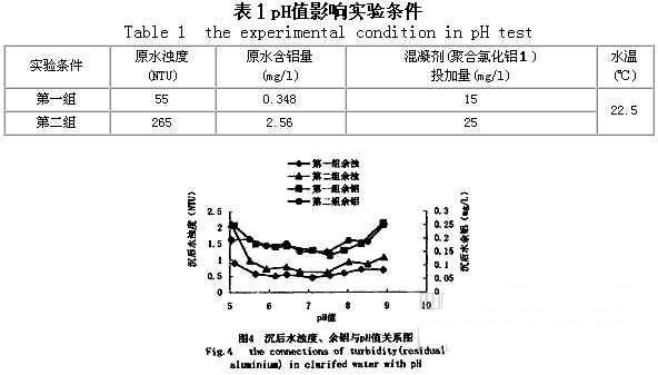 pH值直接影響到鋁在水中的溶解度,是重要的影響因素。為了考察PH值的影響,設(shè)計(jì)了一組混凝實(shí)驗(yàn),條件如表1,實(shí)驗(yàn)結(jié)果如圖4。