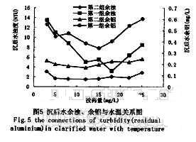 由圖5得到,在水溫較高時(shí),最佳投藥量小,沉后水濁度、余鋁都較低;而當(dāng)水溫降低時(shí),最佳投藥量大,對(duì)應(yīng)于最佳投藥量的沉后水濁度和鋁的去除率都較低,特別是鋁的去除率僅為20~30%,在投藥量過(guò)大或過(guò)小時(shí),甚至?xí)霈F(xiàn)沉后水中的含鋁量大于原水中的含鋁量。這種情況的出現(xiàn)是由于混凝狀況不好,鋁鹽的投入增加了水中鋁的濃度,盡管低溫時(shí)鋁的溶解度降低、溶解鋁占的比重較小,但是相當(dāng)多的顆粒鋁伴隨較多的殘留濁度成分而留在了水中。而且低溫情況下最佳投藥量的范圍較窄,對(duì)投藥的準(zhǔn)確性要求增加。所以對(duì)于含鋁量較高的低溫原水,對(duì)鋁的去除難度較高,很容易超標(biāo),應(yīng)引起注意。