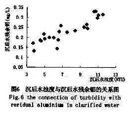 在圖6中,僅改變沉淀時(shí)間,保持其他韻實(shí)驗(yàn)條件(混凝劑采用聚合氯化鋁1)均相同,得到一系列的沉后水,測(cè)定其濁度和殘余鋁,得到二者的對(duì)應(yīng)關(guān)系?梢(jiàn),沉后水殘余鋁在總體上的變化趨勢(shì)隨沉后水濁度的升高而增加,進(jìn)一步說(shuō)明鋁是伴隨濁度的去除而去除的。因此合理地降低沉后水濁度,一般也會(huì)減少出水中的殘余鋁量。