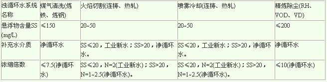 根據(jù)煤氣清洗、火焰切割、噴霧冷卻、精煉除塵等經(jīng)沉淀處理后的濁循環(huán)供水的懸浮物含量約為20~150mg/L,一般鋼鐵企業(yè)工業(yè)新水控制懸浮物含量為10mg/L,濁循環(huán)水系統(tǒng)的有效濃縮倍數(shù)值應(yīng)在2~15范圍內(nèi)。