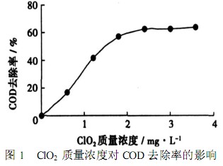 1) ClO2 質(zhì)量濃度從 0 增加到 2. 4 mg/ L ,對COD的去除率從 0 增長到 62. 7 % ,在 ClO2 質(zhì)量濃度達 2. 4 mg/ L 后 ,COD去除率幾乎不再變化。