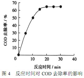 3) 隨著反應(yīng)時間的增加 ,COD 去除率逐漸增長 ,并且到 15 min 時達到 61. 4 % ,以后增長變緩 ,20 min 后達到最大值 64. 9 % ,此后幾乎不再有太大變化。