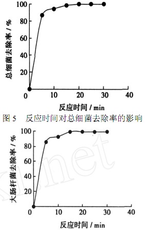 4) 在常溫下隨著反應(yīng)時間的增加 ,總細菌的去除率可以達到99. 9 % ,并且在20 min后達到排放標準;同時大腸桿菌的去除率 30 min 后達到最大值99. 3 %。