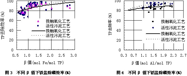 由圖3可知,要達(dá)90%以上的TP去除率,鐵鹽β值應(yīng)在1.6以上。且相同β值情況下,活性污泥工藝的TP去除率優(yōu)于生物接觸氧化的TP去除率。同理,對于鋁鹽β值,要達(dá)90%以上的TP去除率,對于活性污泥工藝應(yīng)在1.2以上,對于生物接觸氧化工藝應(yīng)在2.0以上。相同β值情況下,活性污泥工藝的TP去除率優(yōu)于生物接觸氧化的TP去除率,且程度高于投加鐵鹽的效果。