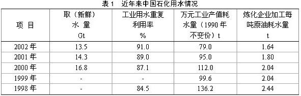國內(nèi)石油化工企業(yè)所在地區(qū)的水資源狀況差異很大,所處地區(qū)的人均水資源占有量為160470 t,且有60%以上的企業(yè)處在嚴(yán)重缺水地區(qū)。并且我國石油化工企業(yè)都是大型聯(lián)合企業(yè),用水量大、污水排放多。據(jù)統(tǒng)計,1997年原石油化工系統(tǒng)加工原油消耗新鮮水13.5億t,約占全國工業(yè)用水總量的2.78%,廢水排放總量8.75億t,占全國工業(yè)廢水排放總量的3.85%,2002年全國石油化工廢水排放總量達33.7億t,占全國廢水排放總量的17.8% [2]。近年中國石化企業(yè)用水情況見表1。