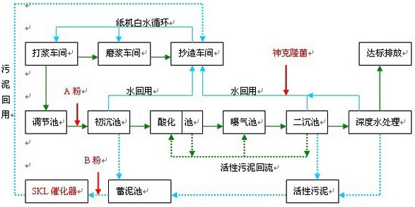 這個(gè)模式主要適用于廢水循環(huán)程度高、濃度大,難以達(dá)標(biāo)排放的企業(yè)。2009年4月南京神克隆公司應(yīng)浙江樂清環(huán)保局的邀請(qǐng),對(duì)樂清市的所有造紙企業(yè)實(shí)施技術(shù)改造,確保減排、達(dá)標(biāo)排放。針對(duì)生產(chǎn)系統(tǒng)高負(fù)荷的水質(zhì),用自主創(chuàng)新的高效污水處理劑神克隆粉,提高物化處理的COD去除率;培育出高效工程菌株神克隆菌,提高生化處理效率。從廢水處理、污泥回用的設(shè)計(jì)、施工、安裝調(diào)試、技術(shù)培訓(xùn)到營(yíng)運(yùn)管理一條龍服務(wù),排放水質(zhì)達(dá)到我國最新排放標(biāo)準(zhǔn)GB3544-2008,COD50~100mg/L,噸紙排放水量降為3~5m3。