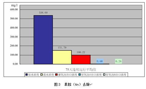 3.2 與硝基苯相比較而言,苯胺對微生物的抑制要弱些,也更容易被高效微生物降解。在進水中,一般要控制苯胺濃度不超過500mg/L,只要控制A/SBR生化處理系統(tǒng)穩(wěn)定運行,出水中的苯胺均可小于1mg/L。