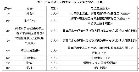 根據(jù)本次設(shè)計實施的工程規(guī)模和特點,參照類似工程運行操作、管理用人經(jīng)驗,擬定本次設(shè)計實施工程的運行操作與管理定員為13人,并成立“三河市泃河環(huán)境生態(tài)工程管理站”,進(jìn)行統(tǒng)一調(diào)度管理。具體定員配置列于表2。
