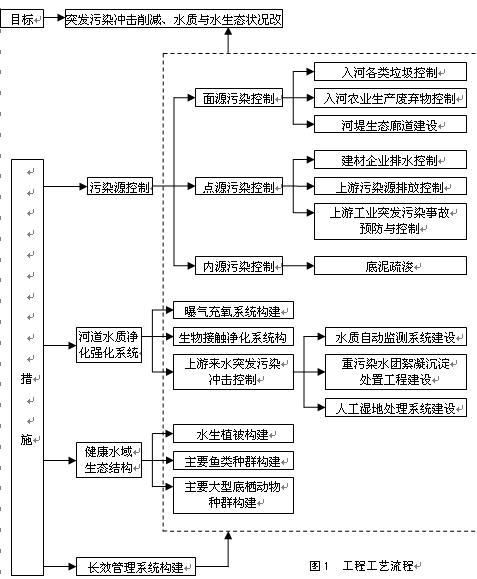 基于以上情況,我們在確立“流域治理”理念與實踐的基礎(chǔ)上,根據(jù)泃河流域地表水環(huán)境功能區(qū)類別,以生態(tài)學(xué)原理、環(huán)境生態(tài)工程學(xué)原理和系統(tǒng)工程學(xué)原理為指導(dǎo),采用水質(zhì)原位凈化與保護(hù)工程技術(shù)和河流生態(tài)工程長效管理技術(shù),制定了泃河三河市段水質(zhì)改善與保護(hù)環(huán)境生態(tài)工程的工藝流程(見圖1),使泃河三河市河段水質(zhì)近期達(dá)到并維持在GB 3838-2002標(biāo)準(zhǔn)Ⅳ~Ⅴ類,遠(yuǎn)期達(dá)到Ⅳ類。