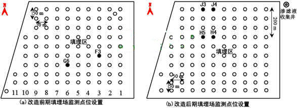 選擇2003年4月~7月連續(xù)監(jiān)測,沿填埋區(qū)沼氣收集管選擇采樣監(jiān)測點,分別為J3、J4、H4、H5,其中,J3、J4間距50m;J4、H4間距200m;滲濾液收集井處監(jiān)測點位為填埋區(qū)東北側滲濾液收集井,點位布置圖如圖1(b)所示。