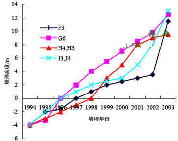 填埋過程概況如圖2所示,整個工程從地面下4m處填埋,至2003年7月已達到地面上12m。2001年G6、F3水位高度分別為地面以上2m、3m;2003年H4、H5水位高度為地面以上7m;2003年H4、H5水位高度為地面以上4m。