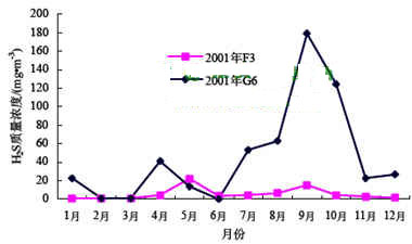2001年選取填埋區(qū)F3、G6兩個垂直型沼氣排放管監(jiān)測H2S氣體,排放管直接取氣分析。結果如圖3所示。