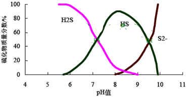 垃圾中包含的各種可降解含硫有機物在微生物的作用下分解為可溶性硫酸鹽,我國城市垃圾填埋場的硫酸鹽變化范圍為6~2904mg/L[7],水解作用為硫酸鹽的生成提供了良好場所,之后硫酸鹽作為電子受體被硫酸鹽厭氧菌降解成硫化物。H2S的產生與硫化物在水體的濃度密切相關[8]。pH值與各種形式的硫化物關系如圖5所示。