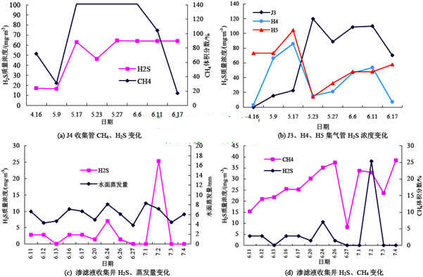 填埋區(qū)共選取J3、J4、H4、H5等4個垂直型沼氣收集管監(jiān)測H2S氣體。H2S取氣口直接取氣分析;CH4采用采氣袋取氣,氣相色譜分析。